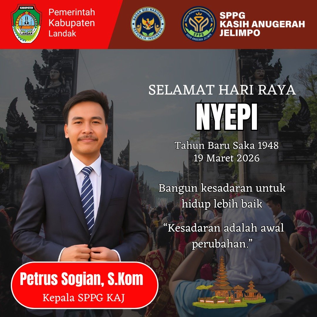 Kamis, 19 Maret 2026. Dalam rangka memperingati Hari Raya Nyepi, SPPG Kasih Anugerah Jelimpo menyampaikan ucapan Selamat Hari Raya Nyepi kepada seluruh umat yang merayakan. Nyepi merupakan momen sakral yang penuh makna, dimana umat Hindu melaksanakan Catur Brata Penyepian sebagai bentuk refleksi diri, penyucian jiwa, serta upaya mencapai keseimbangan antara manusia, alam, dan Sang Pencipta.