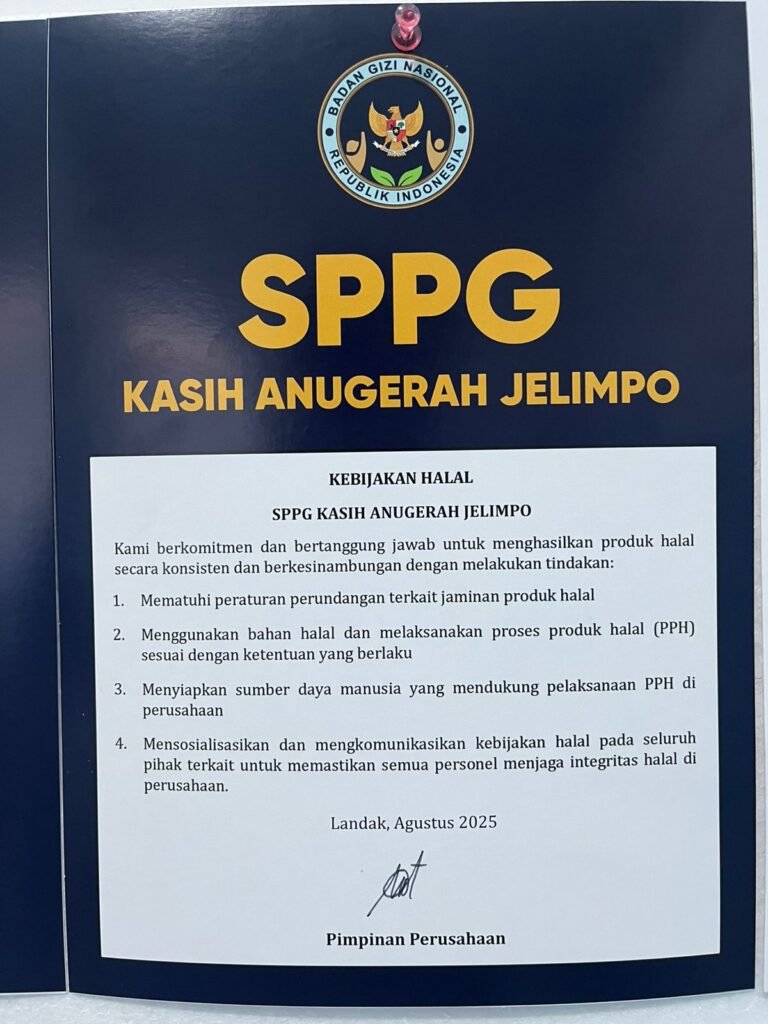 Jelimpo, Kamis, 6 November 2025 — SPPG Kasih Anugerah Jelimpo siap menjalani audit halal yang akan dilaksanakan oleh auditor resmi dari LPH LPPOM (Lembaga Pemeriksa Halal Lembaga Pengkajian Pangan, Obat dan kosmetika) Kalbar mulai malam ini hingga tanggal 7 November 2025. Audit ini merupakan salah satu tahapan penting dalam proses penerbitan Sertifikat Halal, sebagai bentuk komitmen lembaga dalam menjamin bahwa seluruh produk pangan yang diberikan kepada penerima manfaat diolah dari bahan baku yang halal dan aman untuk dikonsumsi. Langkah ini juga menjadi bukti nyata keseriusan lembaga dalam memenuhi standar nasional terkait penyediaan pangan bergizi dan berkualitas.