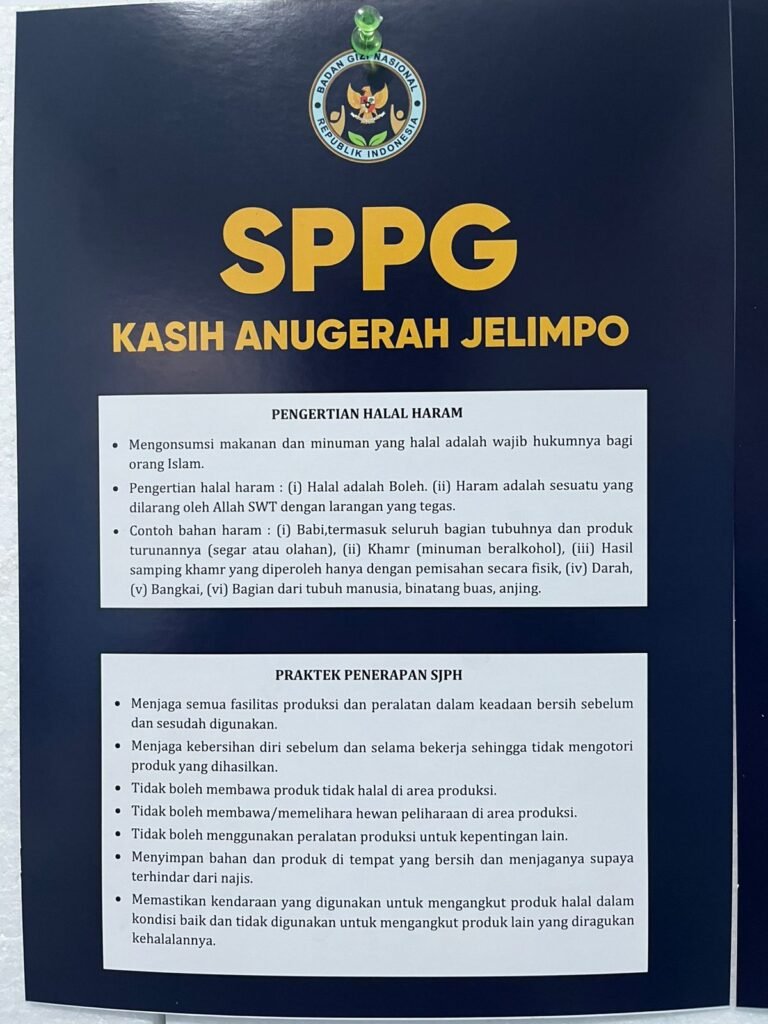 “Dalam pelaksanaan produksi MBG, SPPG Kasih Anugerah Jelimpo didampingi konsultan dan penyelia halal eksternal guna memastikan seluruh tahapan produksi Halal. Setiap proses produksi turut diawasi oleh Bu Haliza Sastri selaku konsultan sekaligus penyelia eksternal, yang berperan penting dalam memastikan penerapan prinsip-prinsip halal di seluruh lini kegiatan produksi SPPG Kasih Anugerah Jelimpo. Pendampingan ini menjadi bagian dari upaya peningkatan kualitas dan kepercayaan publik terhadap produk yang dihasilkan” demikian keterangan bapak Petrus Sogian, S.Kom, selaku Kepala SPPG Kasih Anugerah Jelimpo.